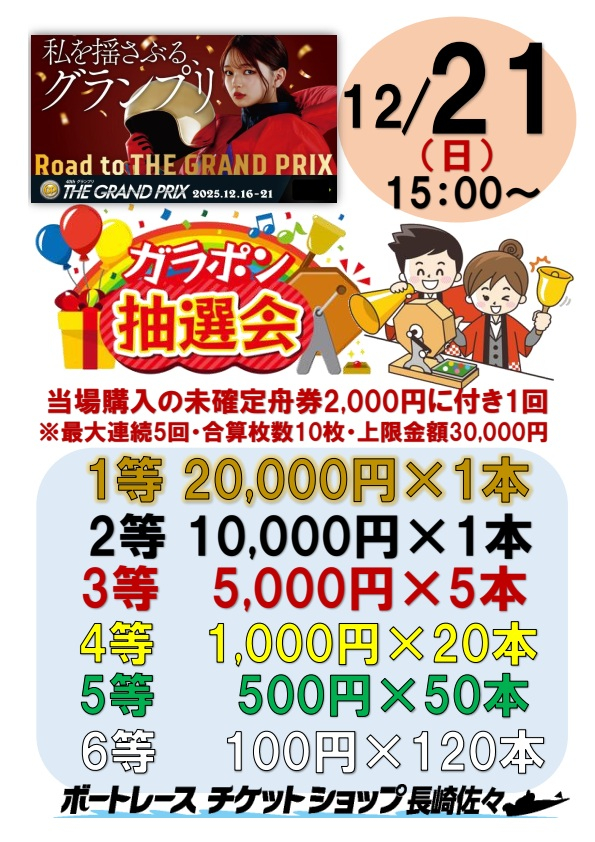 SGグランプリ開催を記念して、12月21日15:00~現金が当たる!ガラポン抽選会を開催いたします。今回の1等は、20,000円!!