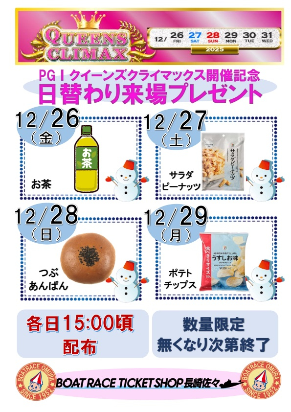 12/26日から開催されるPGⅠクイーンズクライマックス開催を記念して、12/26~29日各日15:00~より、期間中毎日、日替わりにて来場プレゼントを実施致します。