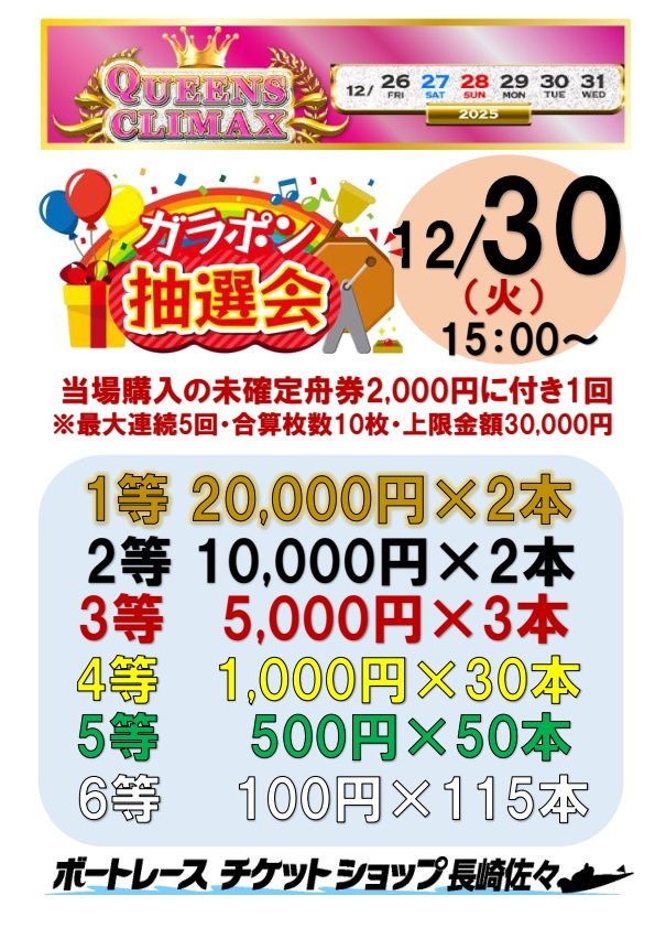 来る12月30日(火)15:00~PGⅠ開催を記念して、1等20,000円が当たる、ガラポン抽選会を開催いたします。