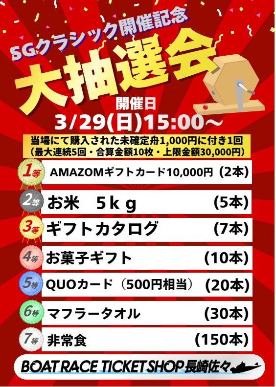 来る3月29日(日)15:00~SGクラシック開催記念ガラポン抽選会を開催致します。